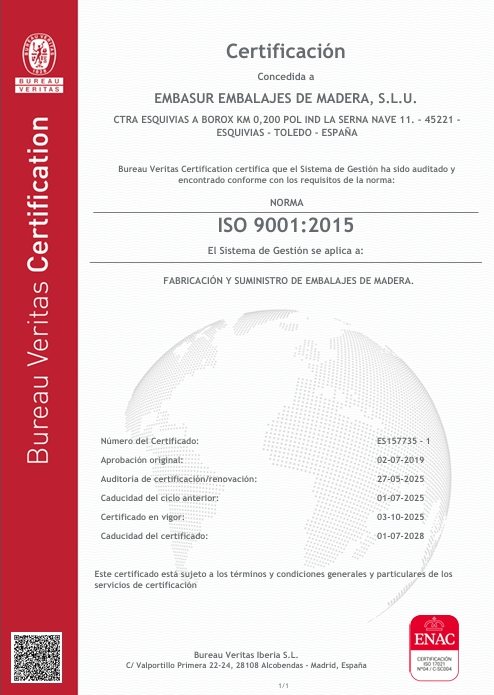 Embasur dispone del certificado de calidad ISO-9001 que avala nuestros procedimientos en fabricación y suministro de embalajes de madera.